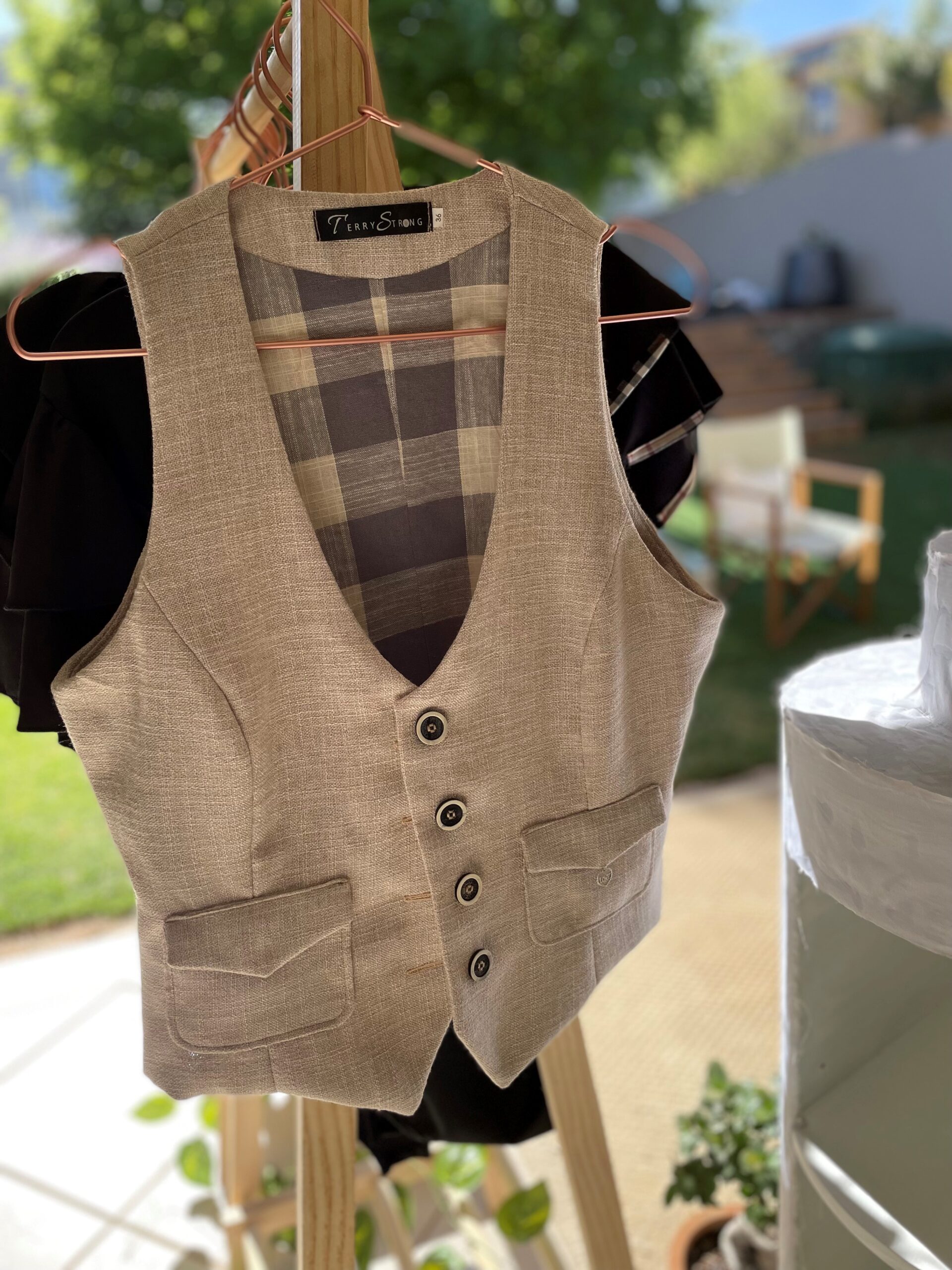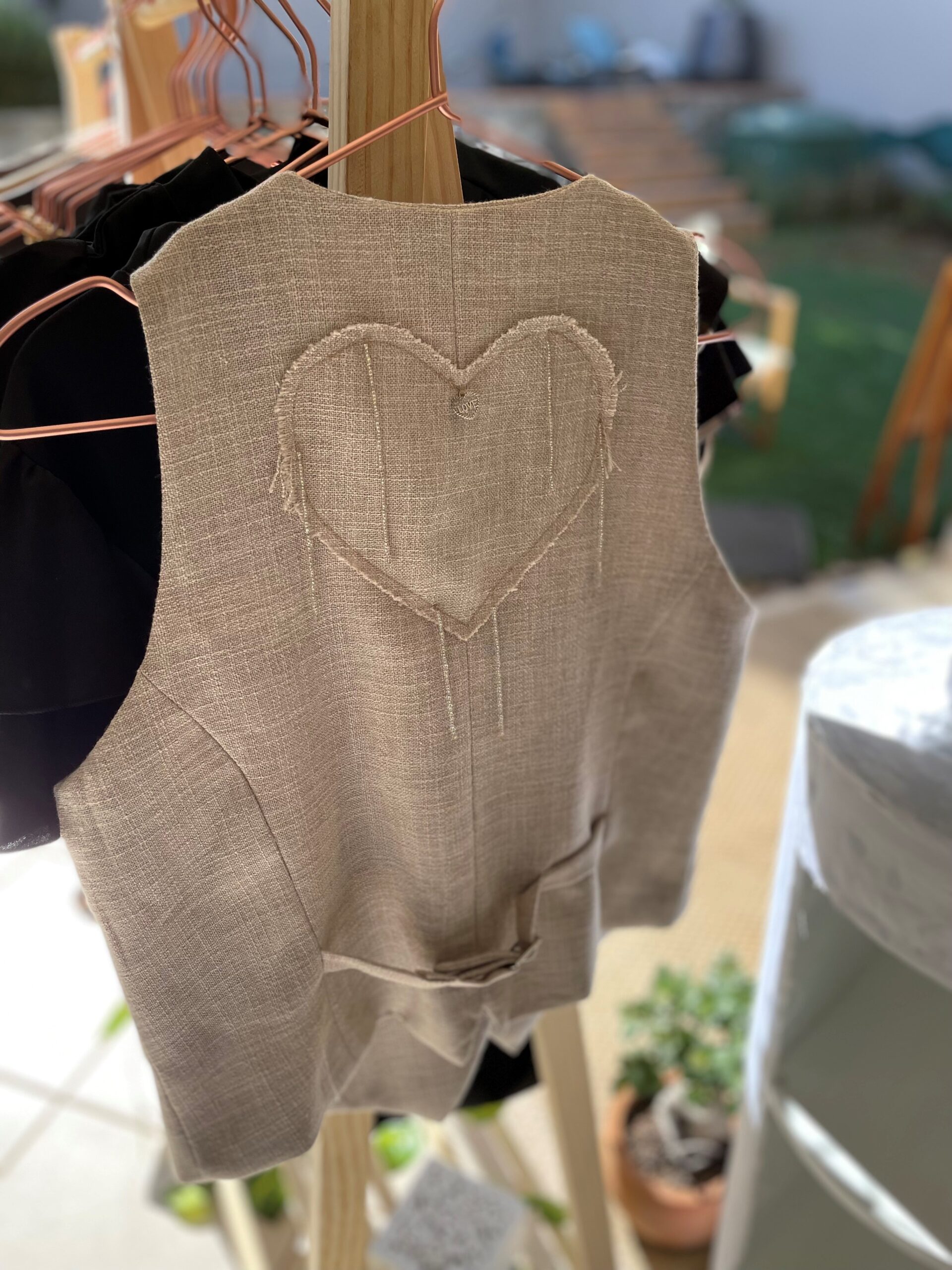 This waistcoat blends timeless craftsmanship with a touch of whimsy for the one who is looking for that essential piece of item that goes with everything and just elevates each layered look. Worn on its own or layered, this soft but durable fabric waistcoat is fully lined, and the standout detail is a quilted heart stitched into the back—a subtle, romantic flourish that adds character without overwhelming the minimalist design.  Structured fit with functional pockets.